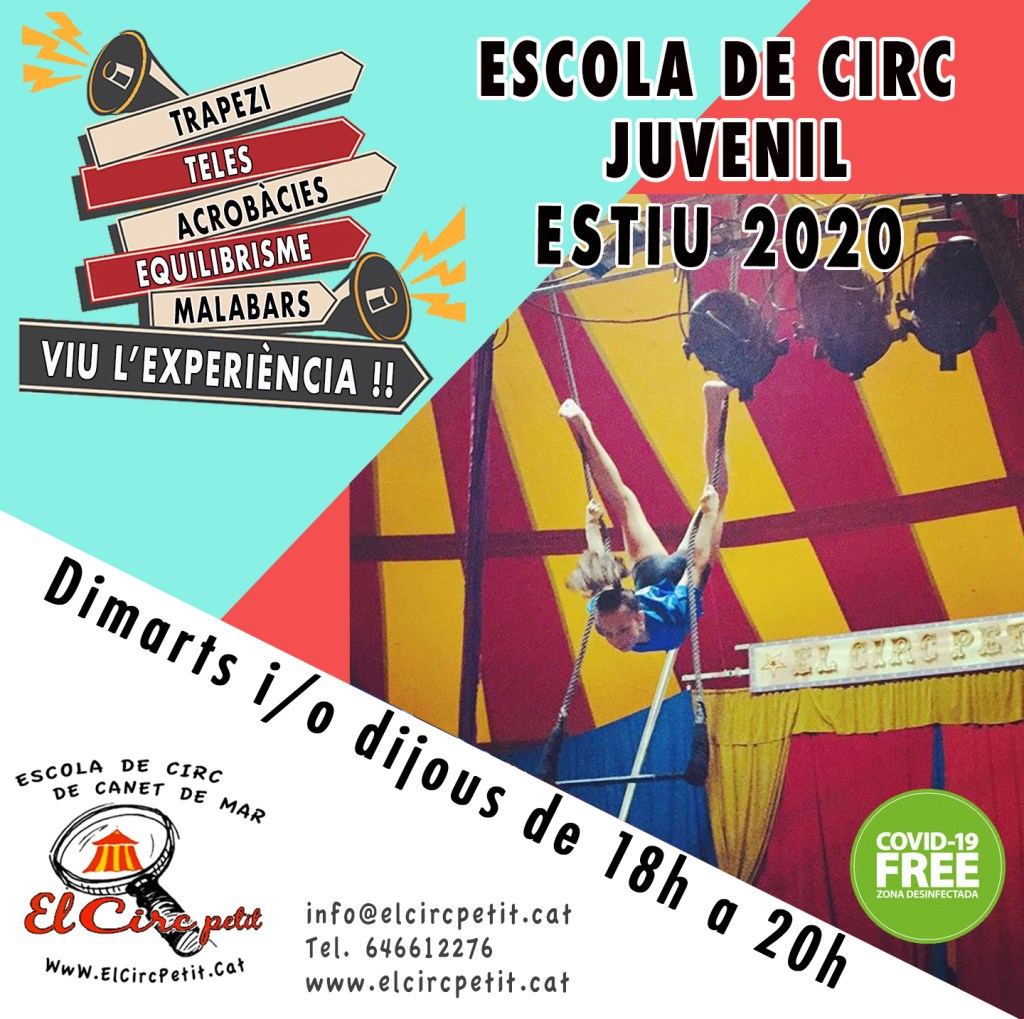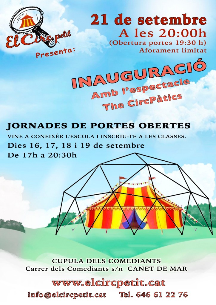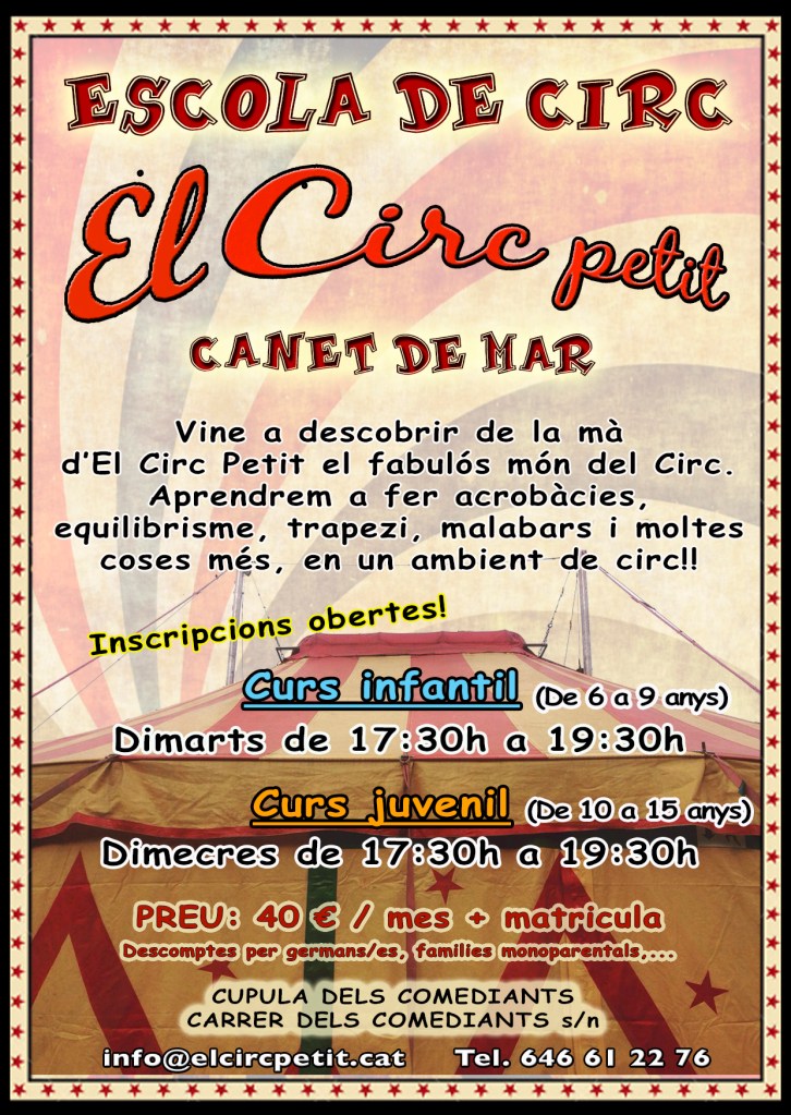 Torna l’escola de circ! Aquest cop a Canet de mar on hem instal.lat una carpa de 13 x 15 metres i en un lloc molt màgic pels amants de la cultura i de l’art, La companyia Comediants ens ha deixat instal.lar-nos dins del seu recinte, és més, dins la seva cúpula!!!
